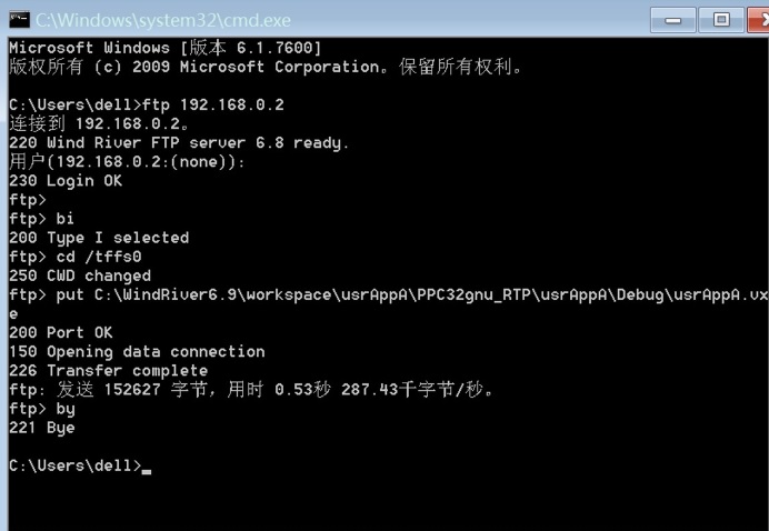 - ftp 192.168.0.2 (该ip可在vxWorks启动后,输入命令ifconfig查看)