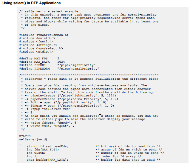 VxWorks的select()函数提供了一种等待多个文件描述的方法(允许任务等待多个设备可用)。VxWorks的select()同UNIX和Windows是兼容的。