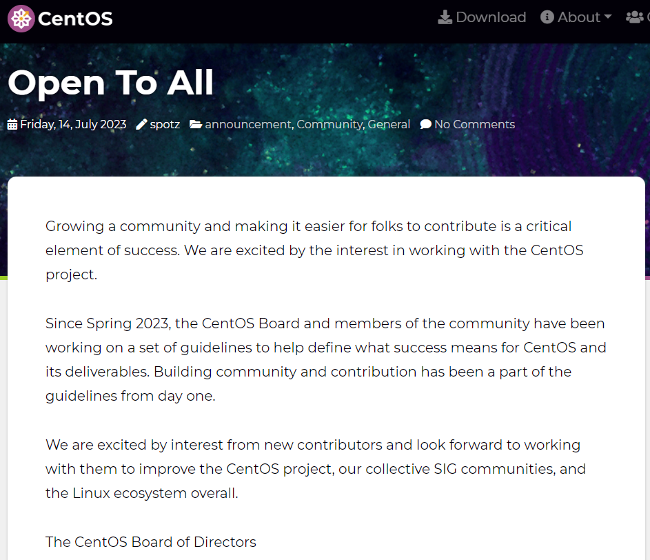博客文章写道:“发展社区并使人们更容易做出贡献是成功的关键要素。我们对与 CentOS 项目合作的兴趣感到兴奋。自 2023 年春季以来,CentOS 董事会和社区成员一直在制定一套指南,以帮助定义 CentOS 及其交付成果的成功意味着什么。建设社区和贡献从第一天起就是指南的一部分。我们对新贡献者的兴趣感到兴奋,并期待与他们合作,改善 CentOS 项目、我们共同的 SIG 社区和整个 Linux 生态系统。”